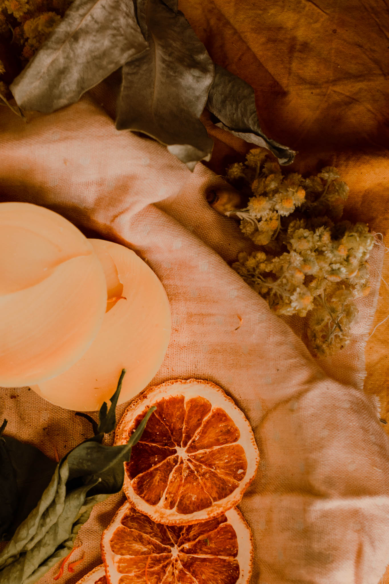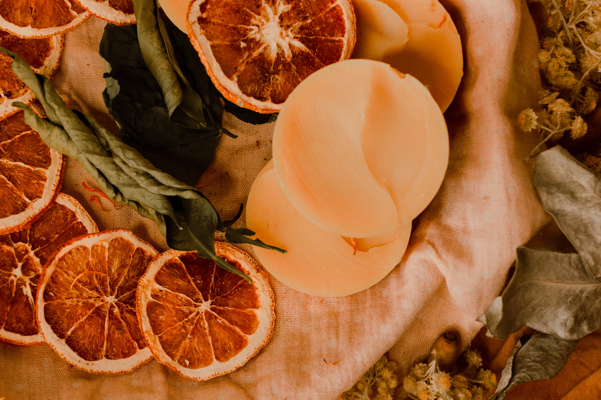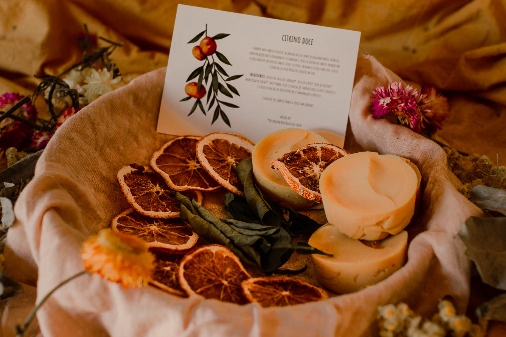 Ingredientes: azeite de casca de laranja (Citrus sinensis), óleo de rícino, manteiga de cacau, mel, naoh, óleo essencial de laranja doce e óleo essencial de erva príncipe