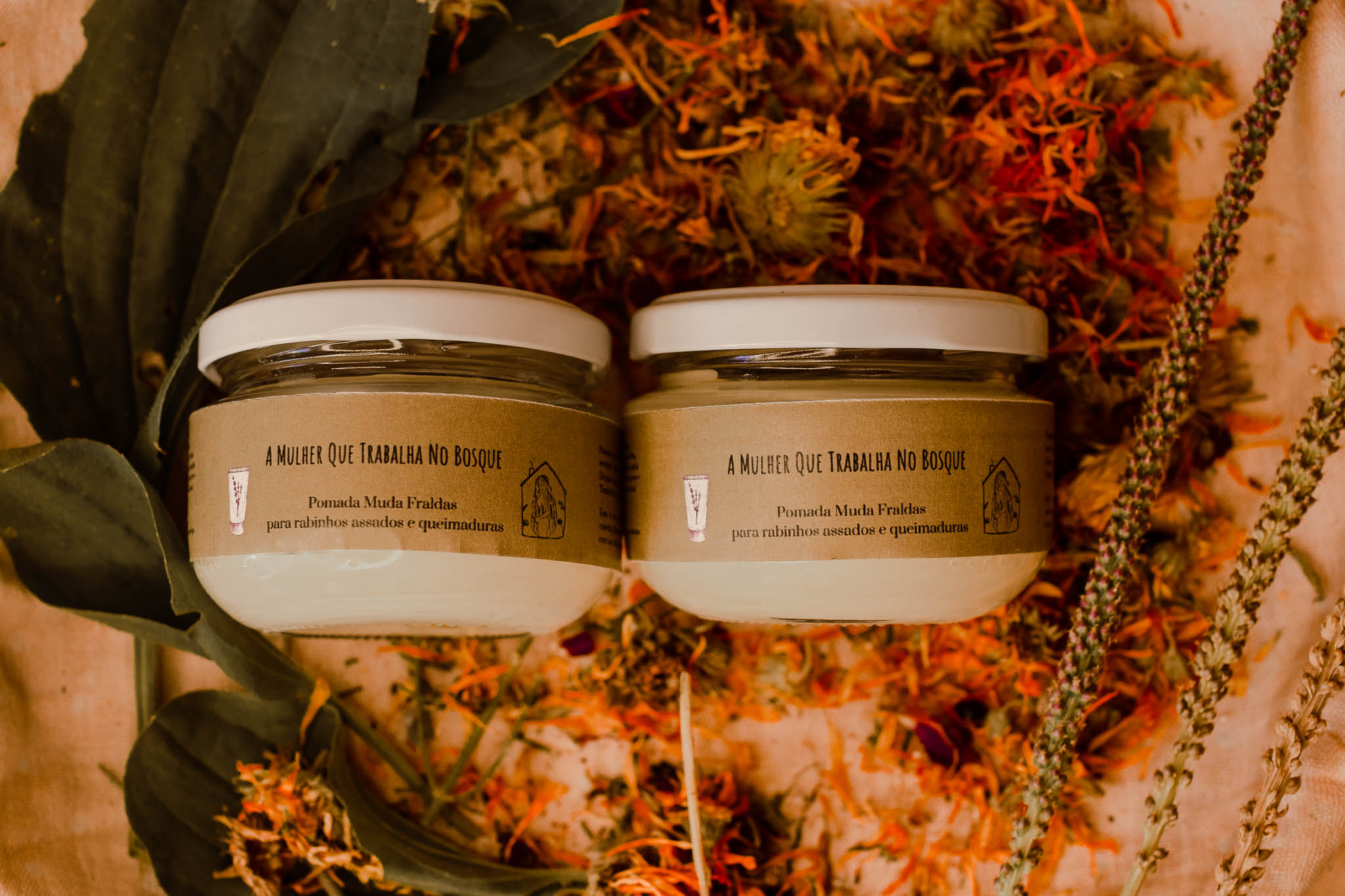 Ingredientes: azeite de calêndula (Calendula officinalis) / hipericão (Hypericum perforatum), tanchagem (Plantago lanceolata) , morugem (Stellaria media) e alfazema (Lavandula angustifolia), banha de porco, cera de abelha, argila branca, óxido de zinco, óleo essencial de alfazema e tea tree. (as plantas podem alterar consoante a sazonalidade).