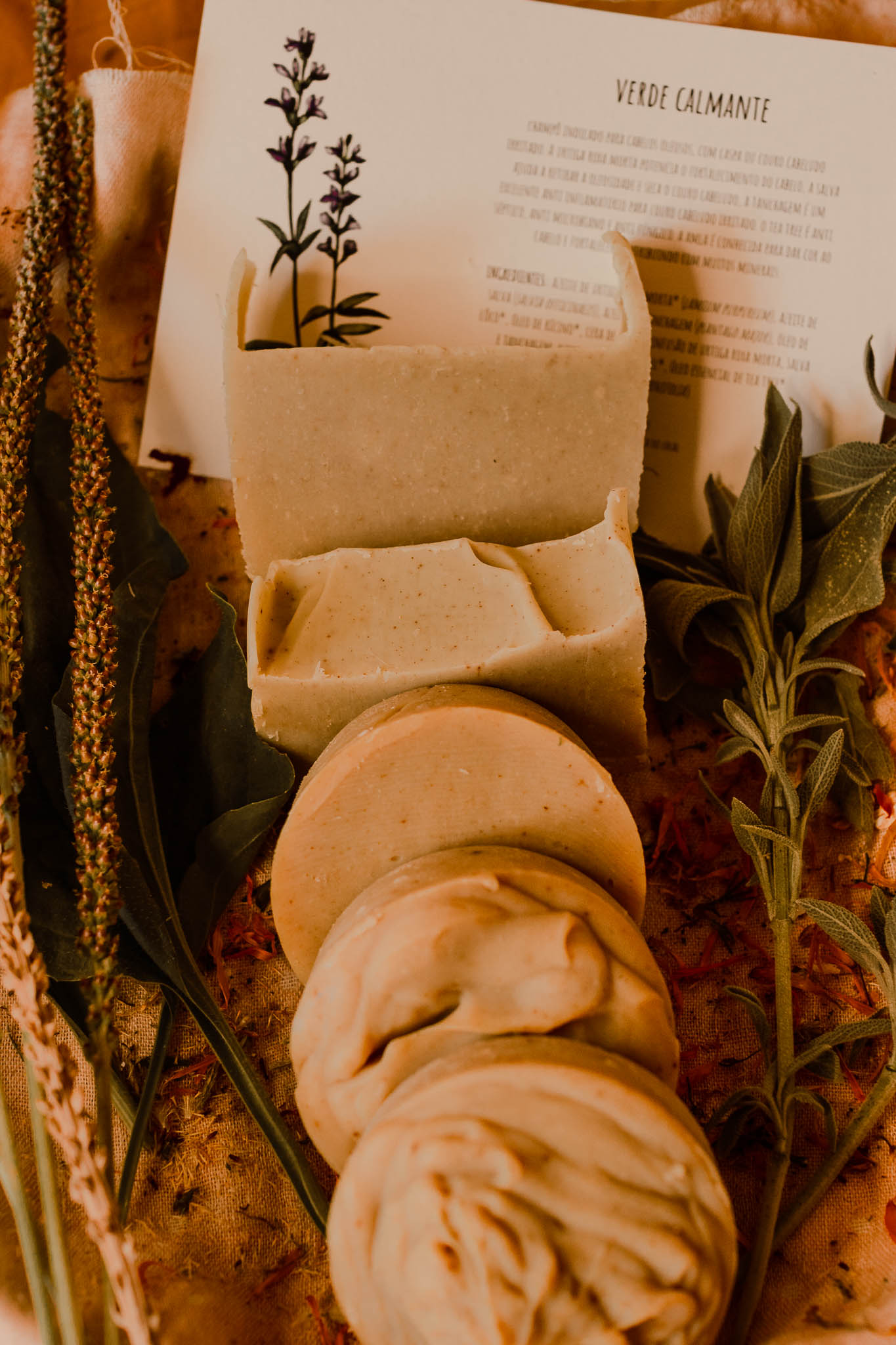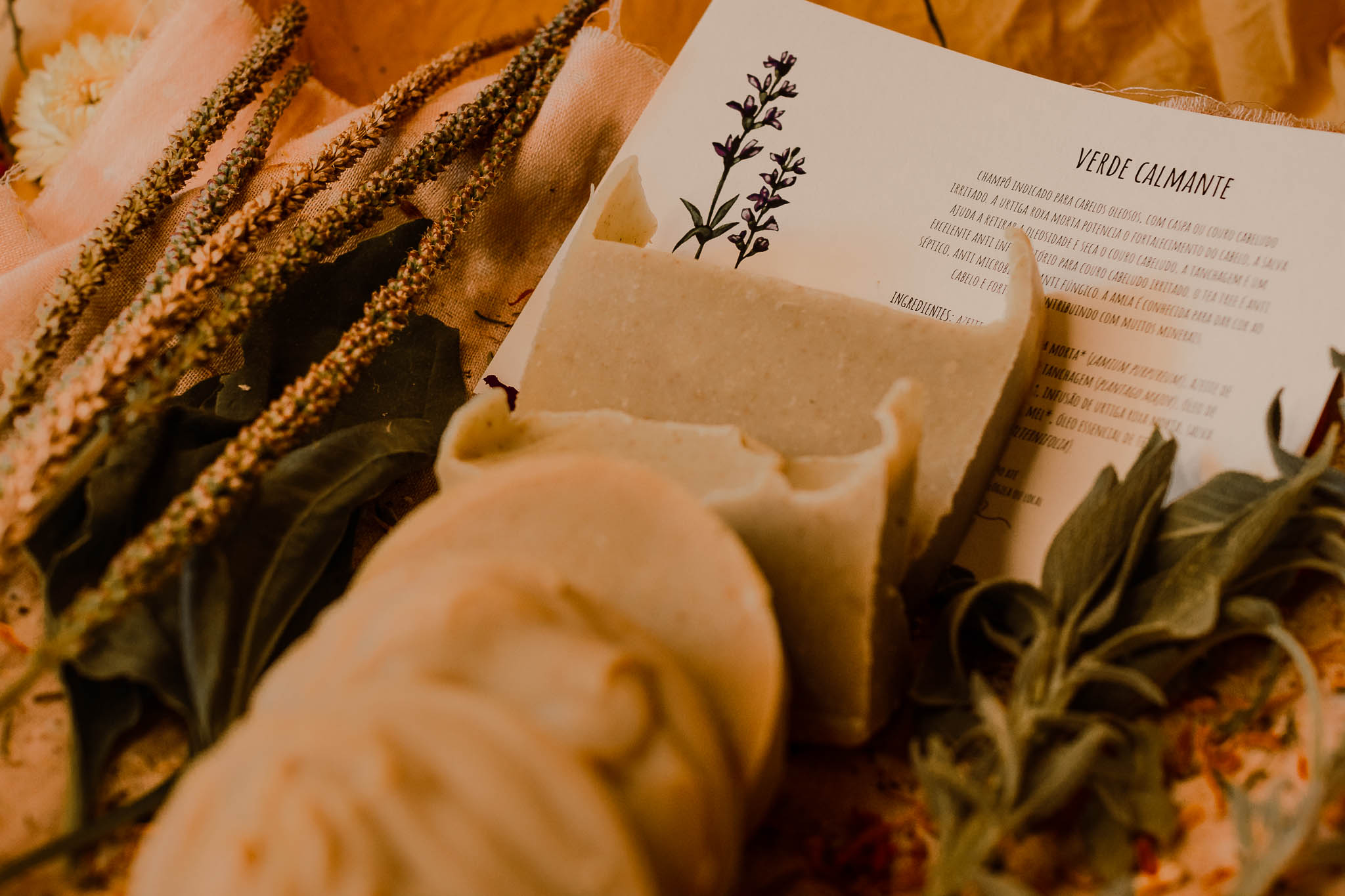 Ingredientes: azeite de urtiga roxa morta (Lamium purpureum), azeite de salva (Salvia officinalis), azeite de tanchagem (Plantago major), óleo de rícino, cera de abelha, infusão de urtiga roxa morta, salva e tanchagem, naoh, amla em pó, mel, óleo essencial de tea tree